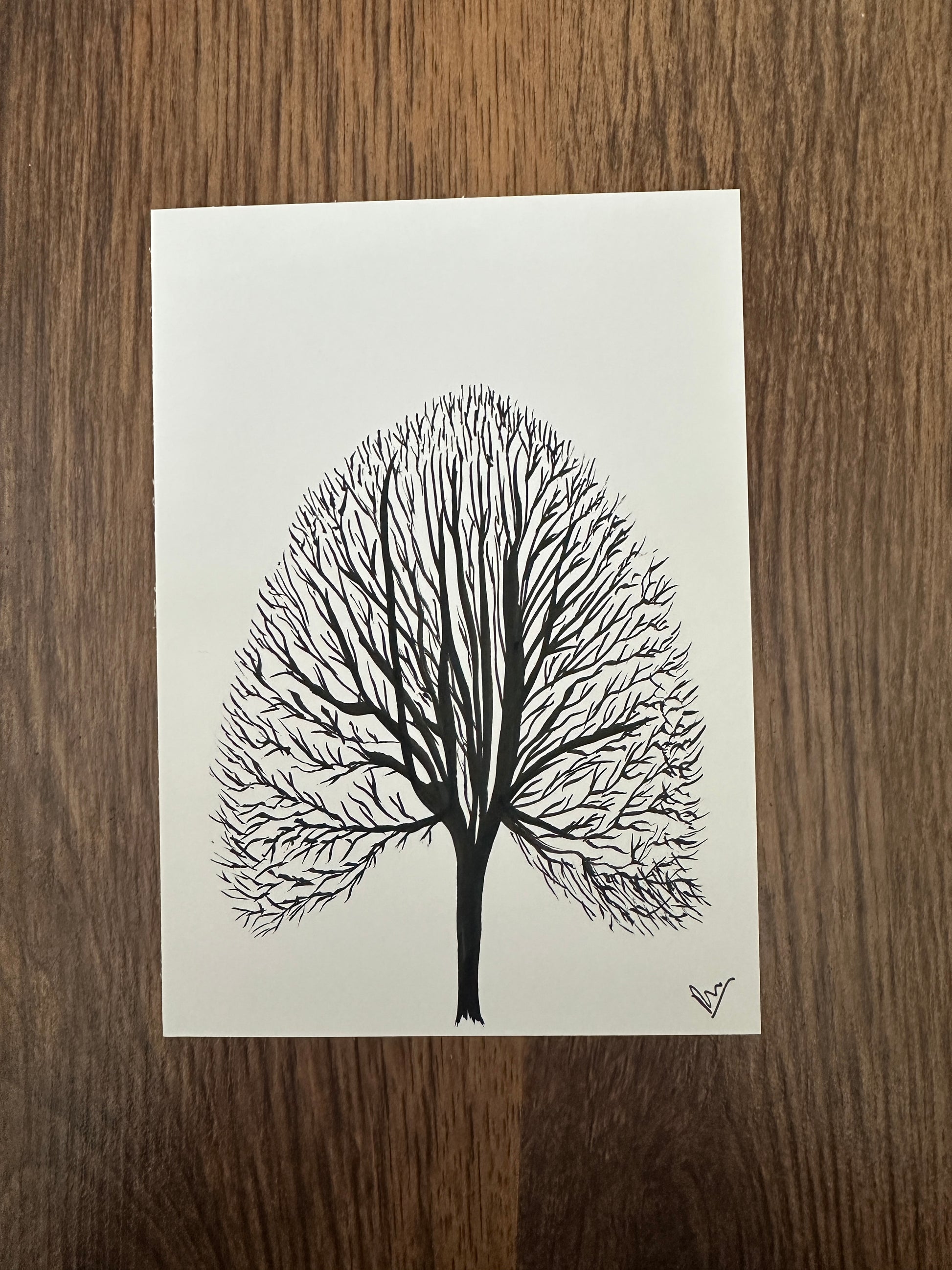 This hand-painted card features a beautifully expressive tree from the historic village of Lavenham, captured in rich black ink. Based on an original photograph taken on location, the artwork brings out the natural textures and quiet strength of the tree with soft, earthy tones and organic lines.